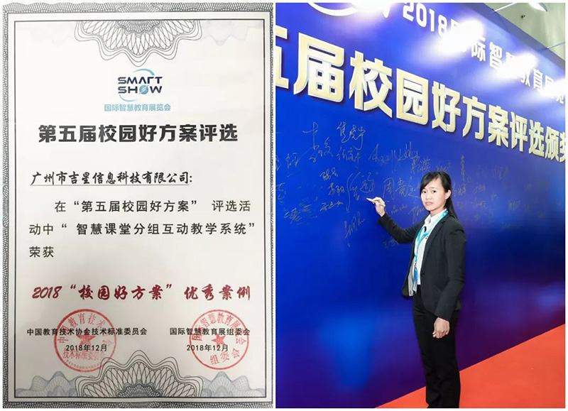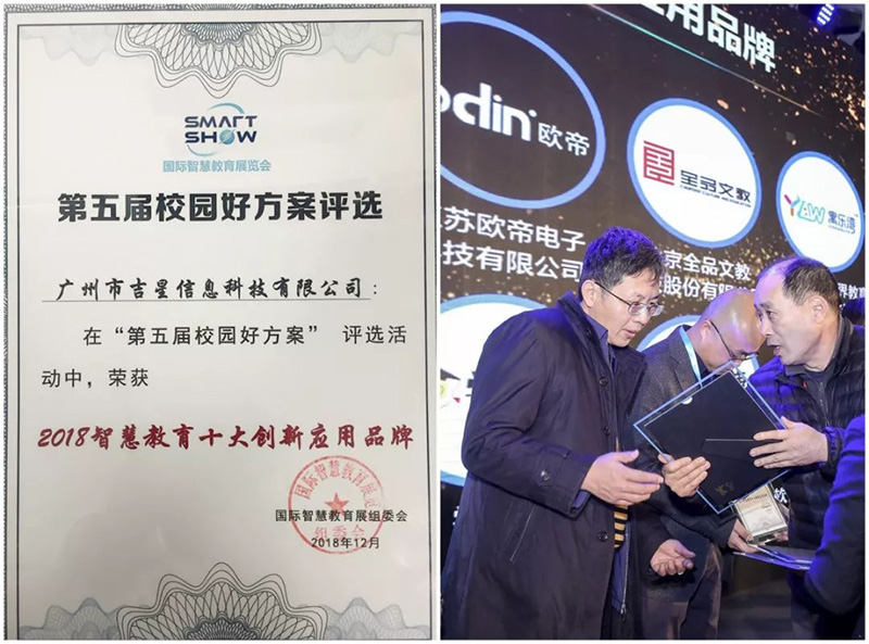 在2018國際智慧教育展上,吉星展示了基于數(shù)字化校園以學生為中心的智慧課堂分組互動教學系統(tǒng)方案收獲了客戶的一致好評,并榮獲 2018“校園好方案”優(yōu)秀案例,吉星信息科技被評為2018智慧教育十大創(chuàng)新應用品牌!