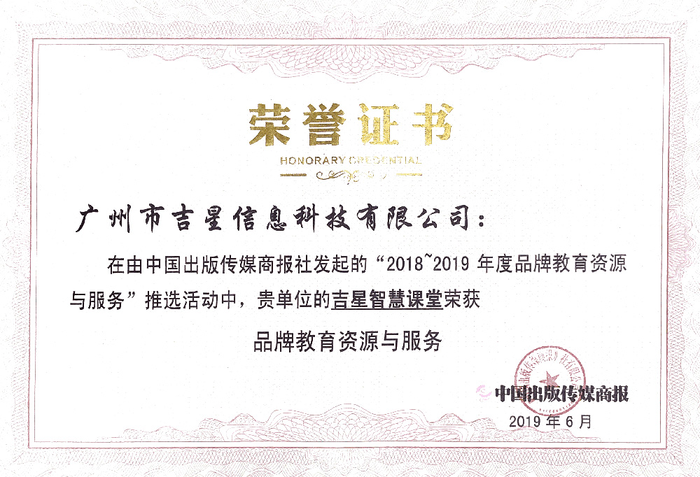 由中國出版?zhèn)髅缴虉?bào)社發(fā)起的“2018~2019年度品牌教育資源與服務(wù)”推選活動中,吉星智慧課堂榮獲“品牌教育資源與服務(wù)”榮譽(yù)稱號。