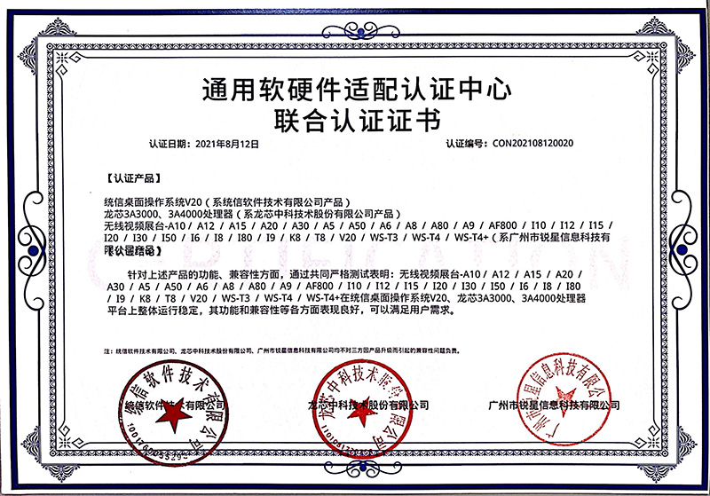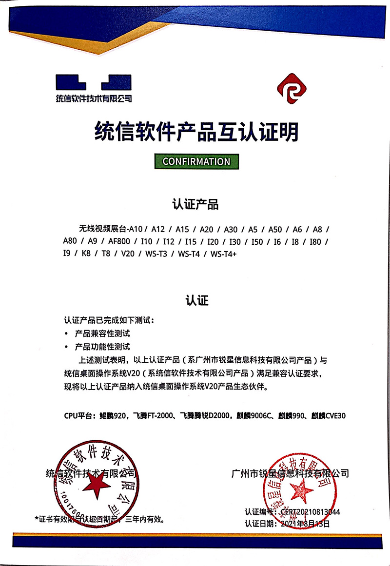 日前,由吉星子公司銳星信息科技自主研發的無線展臺系列產品與統信UOS桌面操作系統V20完成產品兼容性測試以及產品功能性測試。