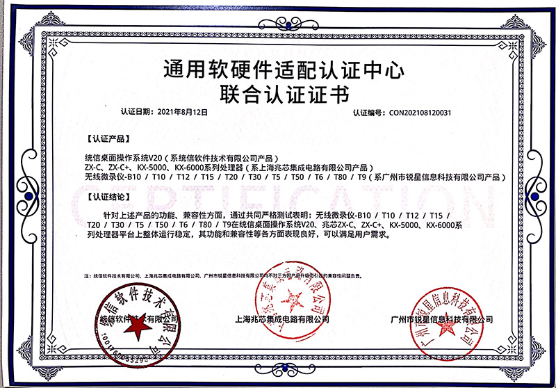 兆芯認證證書(展示互動寶、無線微錄儀)