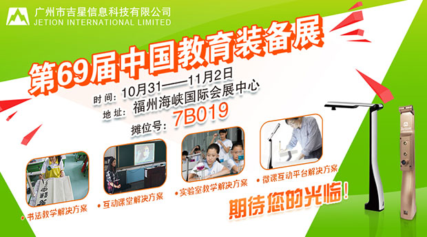 第69屆中國教育裝備展示會將于2015年10月31日-11月2日在福州市海峽國際會展中心隆重舉行,將攜帶“展示互動課堂”、“展示互動書法教學”、“展示互動實驗教學”、“微課互動平臺”基于無線視頻展臺的四大教學解決方案全新亮相。吉星展位號:7B019號,誠邀各位蒞臨吉星展位參觀指導!