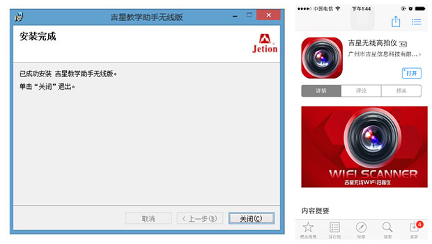 插入隨機附帶的光盤,里面有吉星無線教學助手軟件安裝包(setup.exe)、PDF格式的吉星無線教學助手使用說明及安裝說明。安裝非常簡單,根據(jù)提示一步步進行安裝,整個操作過程在1分鐘之內(nèi)完成。安裝完PC端程序后,我又忍不住給我的手機也進行了移動端的安裝,想兩者同步進行測試,體驗一下廠家宣傳的多平臺無縫對接。