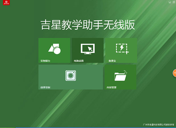 打開無線視頻展臺開關,在手機和電腦的搜索吉星展臺的WiFi信號(Jetion_后綴),輸入原始密碼12345678,即可連接上設備。沒拿到展臺之前我還在疑慮:無線展臺雖說可以脫線使用,但如果學校沒有無線網(wǎng)絡,那無線功能再方便也不實用??!用了才知道,無線展臺內(nèi)置WiFi模塊,自身會發(fā)射出WiFi熱點讓其它設備進行連接,實在太方便了!但操作進行到這里我又突然想到:像臺式機,沒有WiFi功能那怎么進行連接?帶著疑問又翻翻說明書,果然廠家早就考慮到這個問題,隨機附送了一個150Mbps無線USB網(wǎng)卡,給設備安裝程序后就可以接收WiFi了。無線網(wǎng)卡還可以解決設備連接展臺后不能同時上網(wǎng)的問題。由此看來廠家真是服務貼心,誠意十足!安裝完成后打開桌面的軟件圖標,軟件界面非常簡潔,綠色的主頁面只有五個方形功能模塊,以及一個簡單的企業(yè)LOGO。