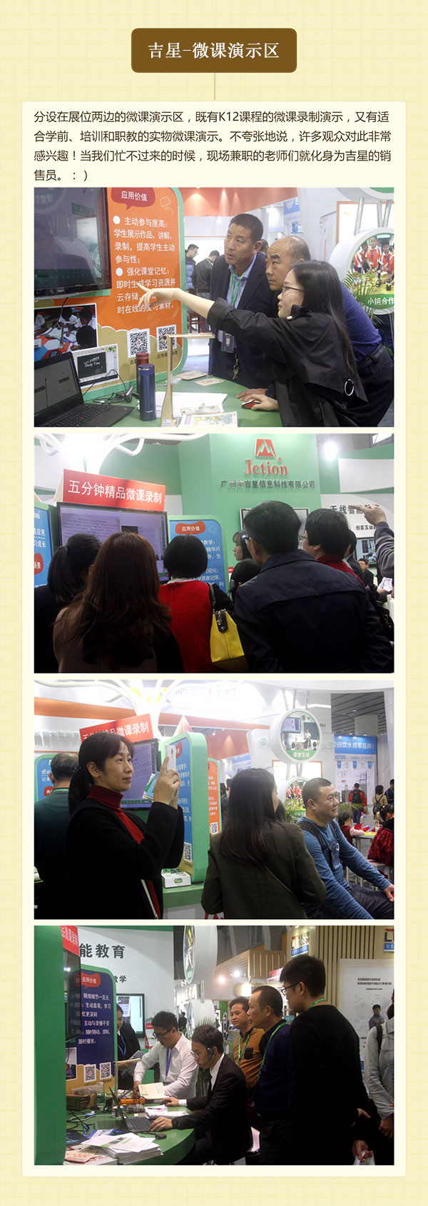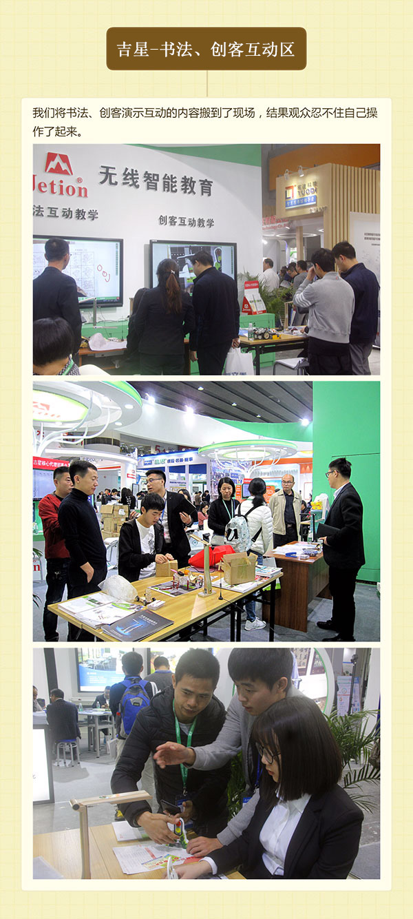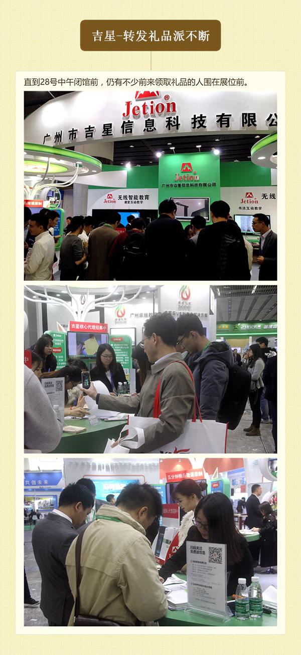 從26號9點開展,到28號中午11:30閉展,期間,在5.1館A005展位的吉星,帶著無線視頻展臺/無線微錄儀、各種學(xué)科的課堂互動應(yīng)用方案、神秘的全新升級產(chǎn)品、免費派送的各式禮包,忙碌著和前來參觀指導(dǎo)的新老朋友們愉快相見。